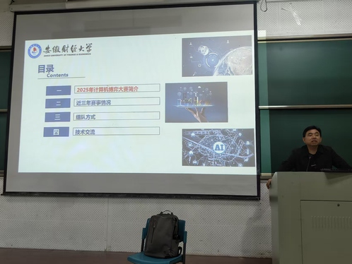 宣讲会首先由李敬明老师发言。他系统介绍了计算机博弈大赛的组织架构、赛程安排以及我校近三年在该赛事中的获奖情况,并公布了2025年校内选拔赛的报名时间。李老师指出,我校近年来在该赛事中表现持续进步,为今年选拔赛的顺利开展打下了良好基础。