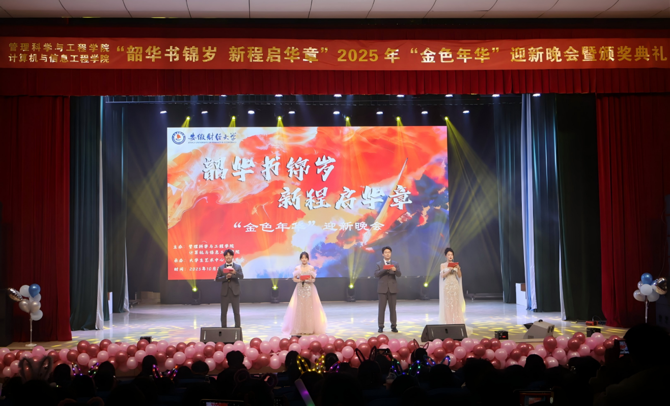 韶华书锦岁,新程启华章。10月25日晚,管工学院与计信学院联合主办的2025年“金色年华”迎新晚会暨颁奖典礼在龙湖东校区艺术楼报告厅圆满落幕。校党委常委、副校长王兵,九六信管励学基金委员会主席郭祥涛,计算机与信息工程学院党委书记刘朝新,管理科学与工程学院院长戴道明、党委副书记(主持工作)周杨波、副院长魏瑞斌、党委副书记樊元华,全体新生辅导员及2025级新生齐聚一堂,共赏这场青春洋溢的文艺盛宴。