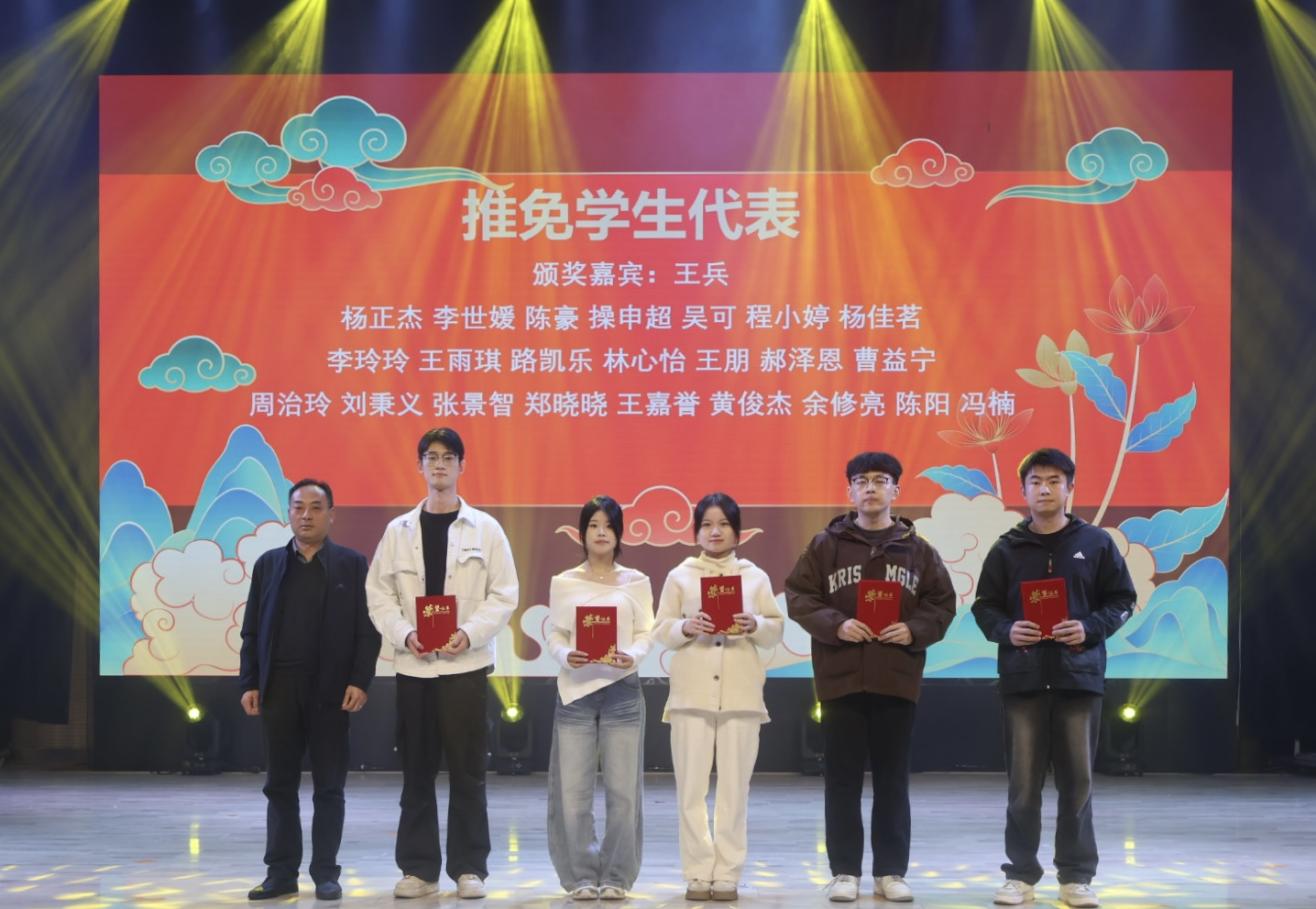 晚会特别设置的颁奖环节将现场气氛推向高潮。王兵、郭祥涛分别为推免学生代表和信管九六励学金获得者颁奖,学院领导也依次为校优秀学生代表、国家奖学金获得者学生代表颁奖,以此激励2025级新生以优秀学子为榜样,在未来的大学生活中勇于追求卓越、不断超越自我。