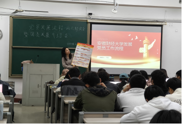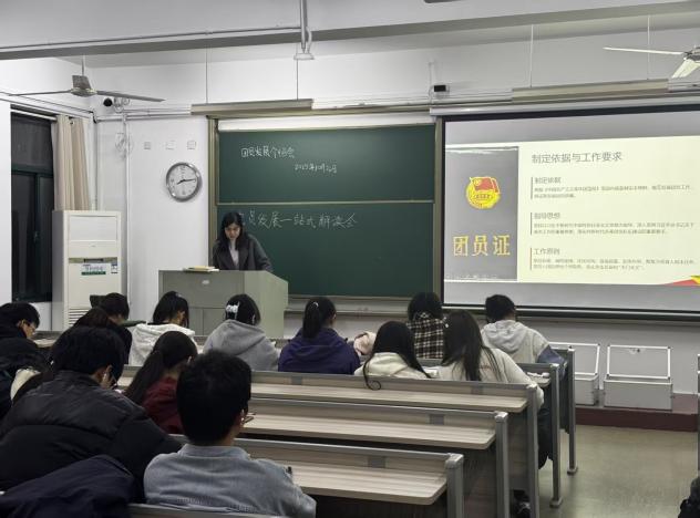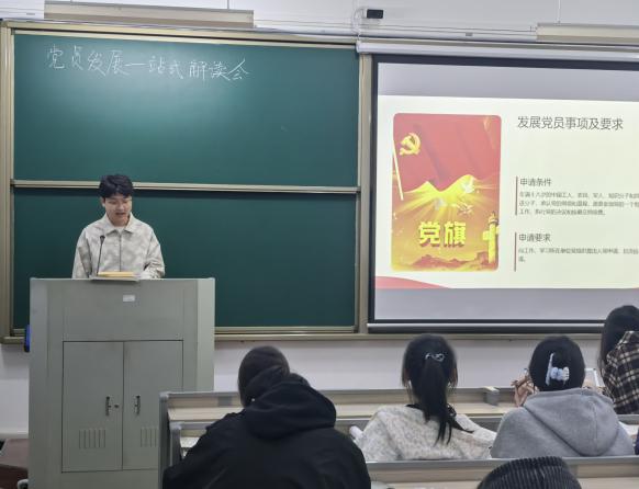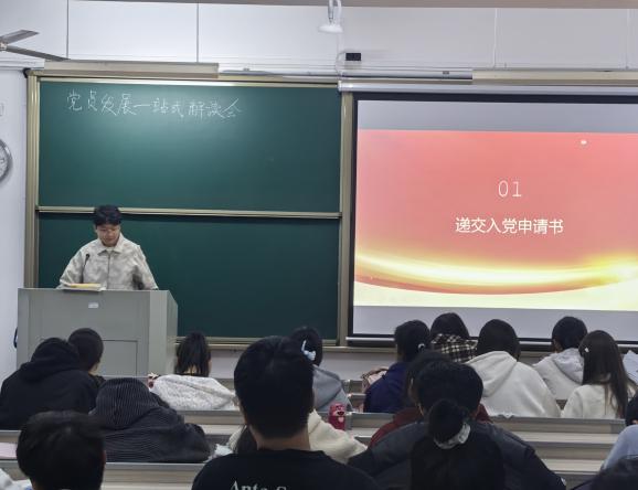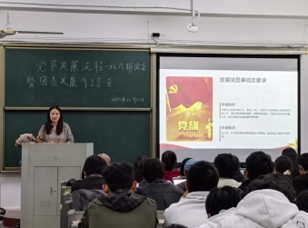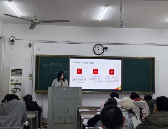 在集中学习环节,丁莹老师以《中国共产主义青年团章程》和《中国共产党发展党员工作细则》为依据,结合学校具体实施办法,系统梳理了党员、团员发展的核心流程,详细解读了发展党员各环节的规范要求,并重点强调了关键阶段的纪律与标准。讲解内容既有政策高度,又贴近学生实际,为后续宣讲打下扎实基础。