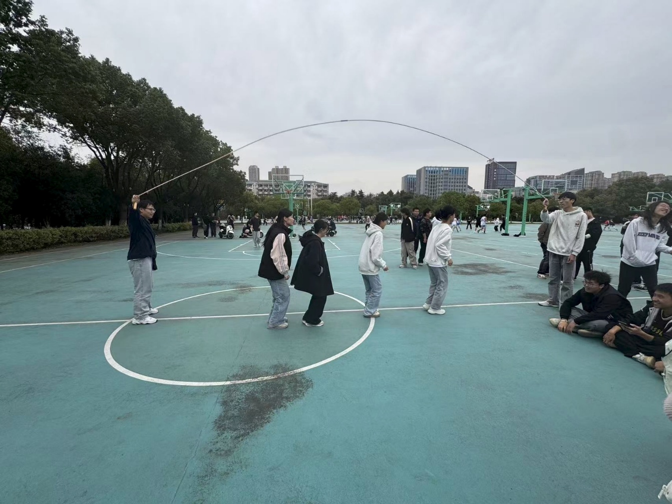 紧接着进行的集体跳绳项目,考验着小组的协作与节奏。随着摇绳同学手臂的摆动,绳子在空中划出整齐的弧线,队员们则按照“一、二、三”的口号依次跃入绳中。刚开始,部分小组因节奏不一出现失误,但大家迅速调整状态,互相鼓励,慢慢地,越来越多小组找到了默契,队员们像“小弹簧”一样灵活跳跃,连贯的动作让现场叫好声不断。